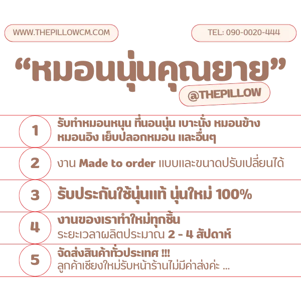 สินค้าของเราเป็นงาน Craft product เราให้ความสำคัญกับความต้องการใช้งานของลูกค้าเป็นหลัก เน้นการออกแบบตัดเย็บ "ชิ้นต่อชิ้น" ให้พอดีกับเฟอร์นิเจอร์ของลูกค้าหรือตามขนาดที่ลูกค้าต้องการ สินค้าทุกรายการเป็นงานยัดนุ่น รับประกันร้านเราใช้นุ่นแท้ นุ่นใหม่ นุ่นธรรมชาติ 100% แข็งแรง ทนทาน อายุการใช้งานยาวนาน... สอบถามเพิ่มเติมแอดไลน์ ID : @thepillow (มี @ นำหน้าด้วยนะคะ) หรือ โทร. 090-0020-444 ยินดีให้บริการค่ะ